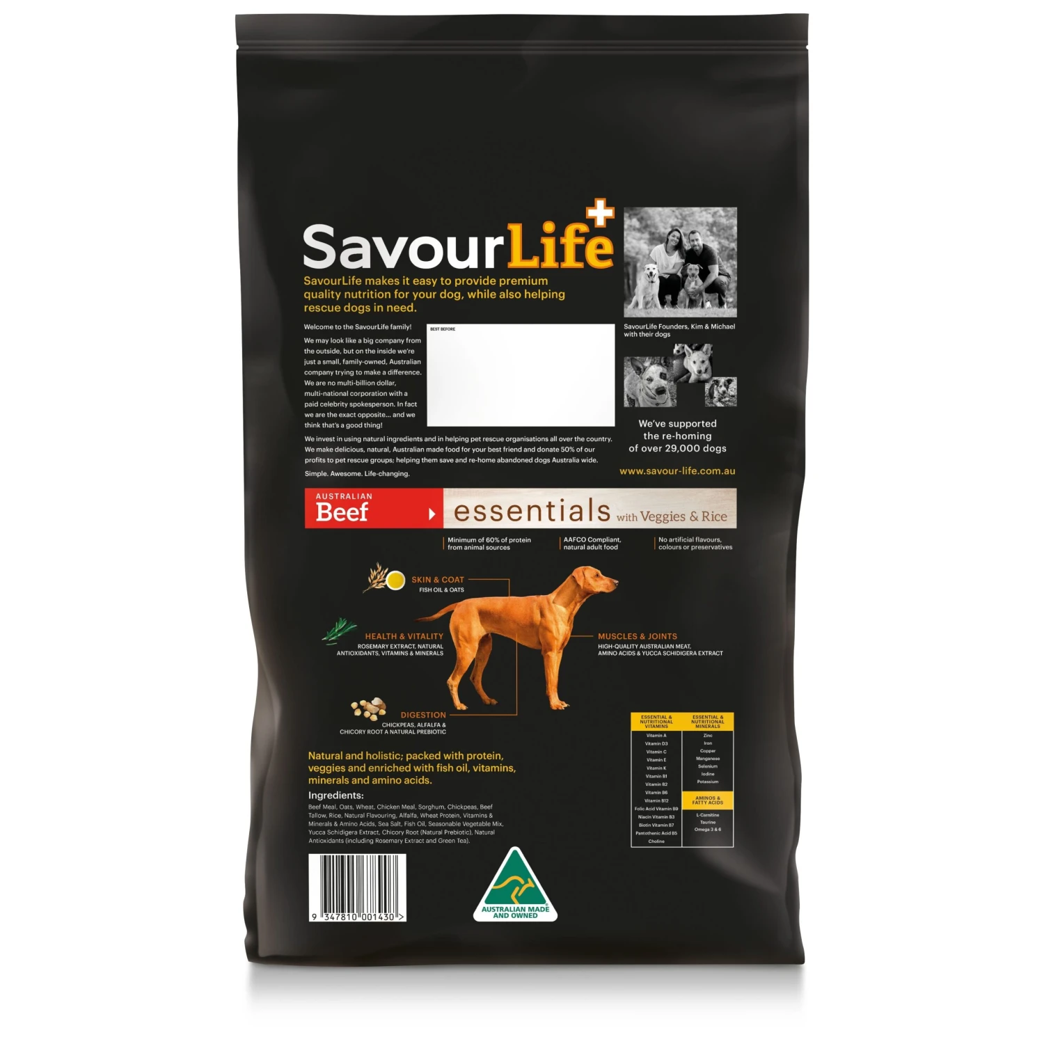 SavourLife Essentials Beef with Veggies & Rice is an all-natural, Australian-made and owned food, made with Australian meat and packed with seasonal vegetables, fish oil, plus vitamins, minerals, natural pre-biotics and amino acids, tailored to meet the nutritional needs of adult dogs. There are absolutely no artificial flavours, colours or preservatives. Beef is an option for dogs who like something a little different. Beef is full of vitamins and minerals like B3 essential for converting fats into energy and B12, responsible for key functions like the brain and nervous system. It is also rich in Iron which is essential for helping red blood cells carry oxygen and nutrients through the body.